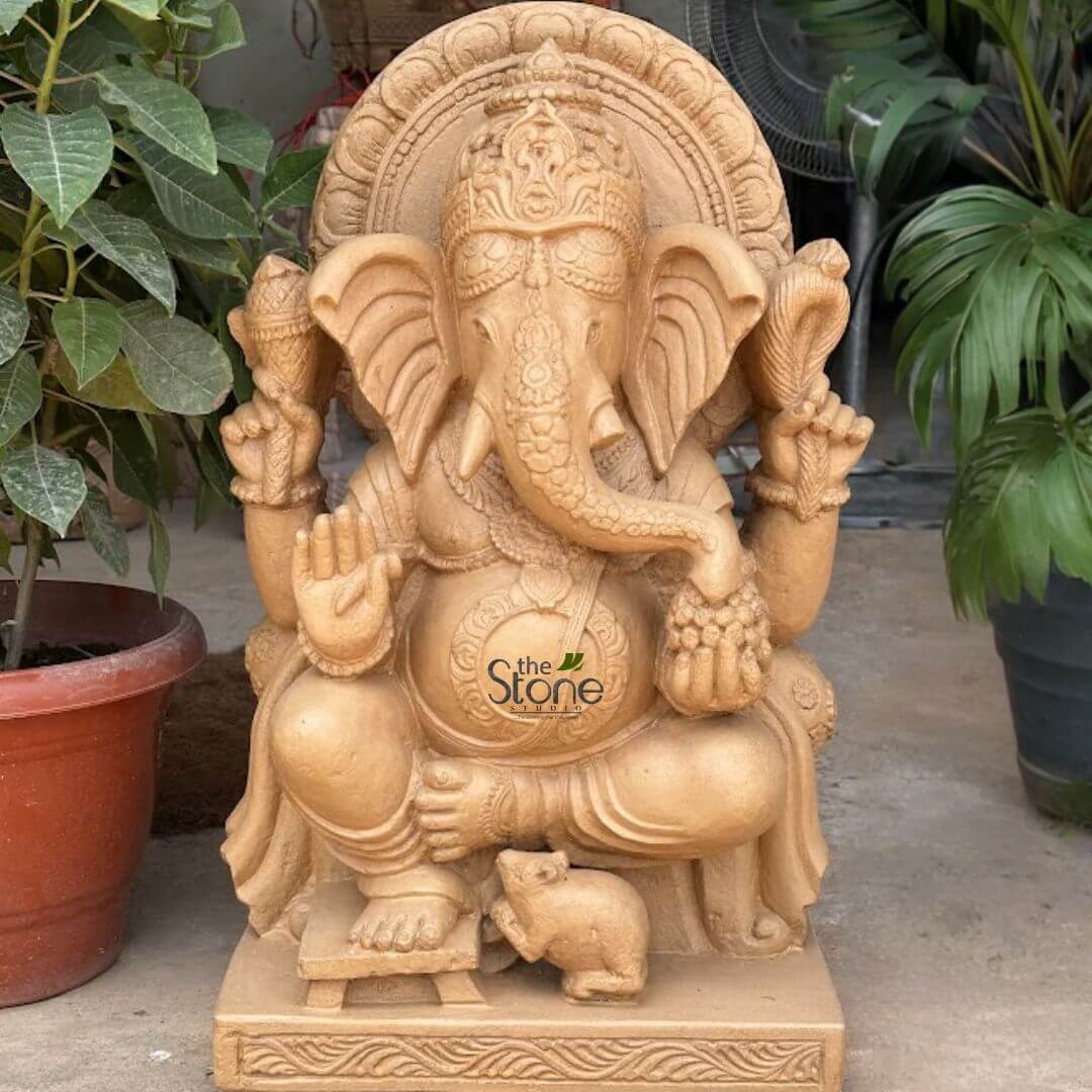 The material used in it is Sandstone. Our best artisans wonderfully craft this sculpture. For more such statues browse our website. If you still don’t get what you want, our artisans will craft your specified designs of 2 feet Sandstone Ganesha statue with utmost care and love.