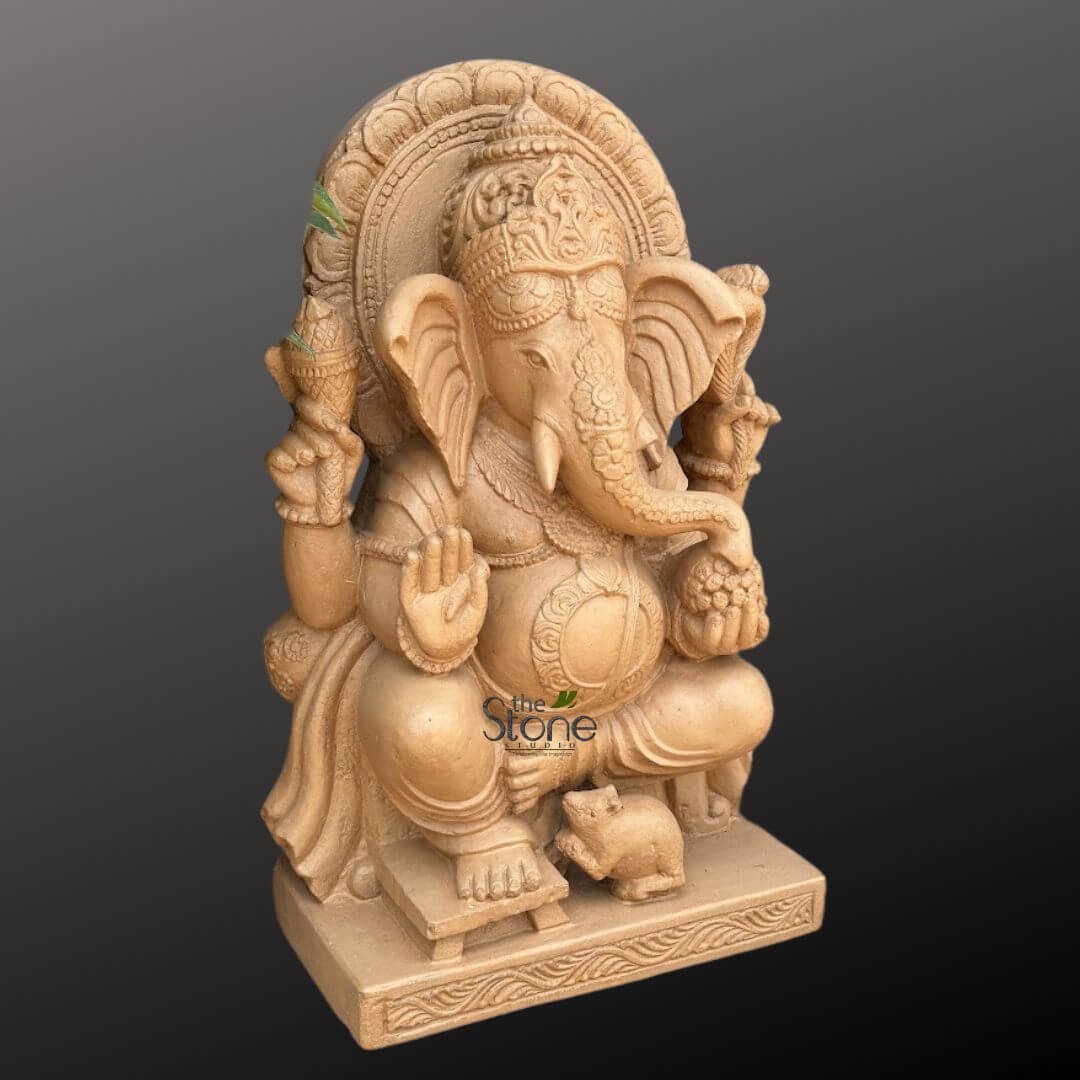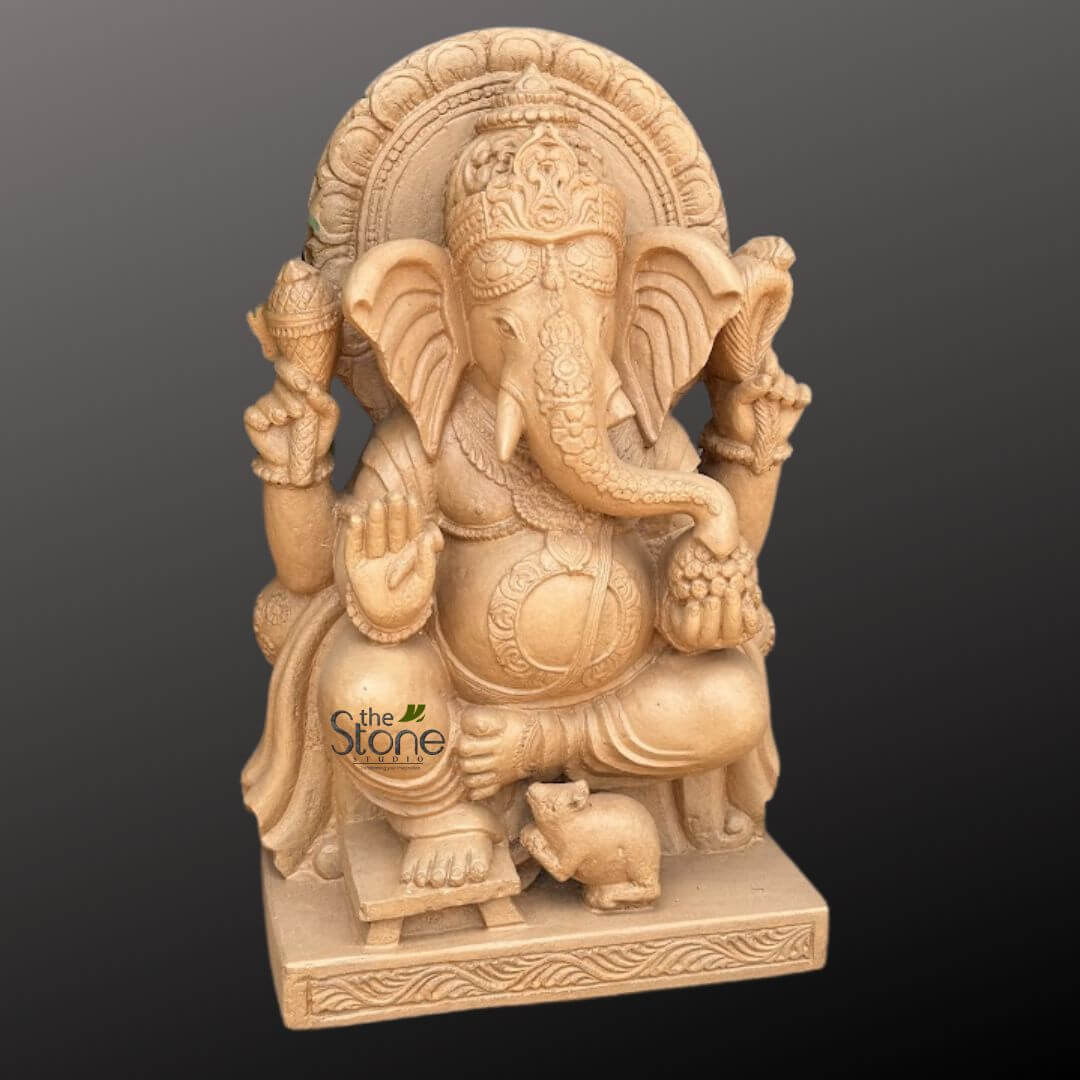 The sandstone keeps its natural roughness, but the details—like Ganesha’s gentle features and the fancy patterns on the throne—are very clear, even at this small size.