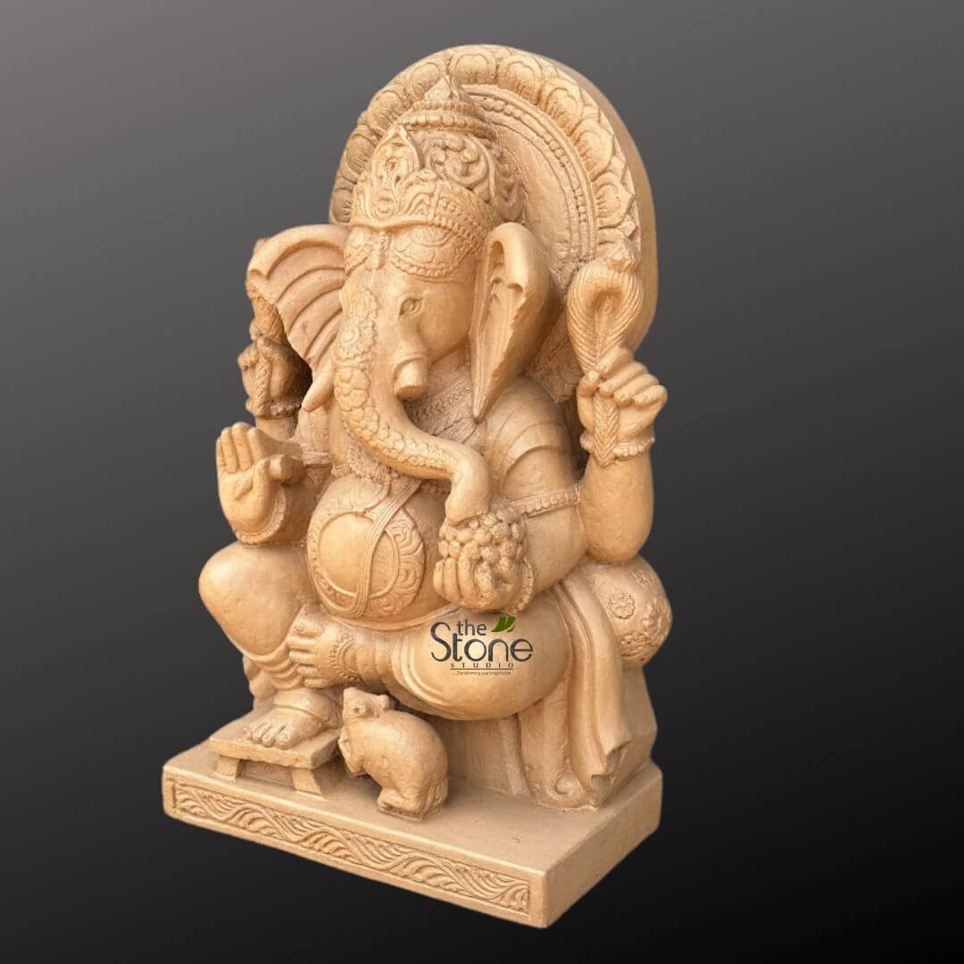 Lord Ganesha sits gracefully on a royal throne called a Singhasan, which represents his authority and wisdom.
