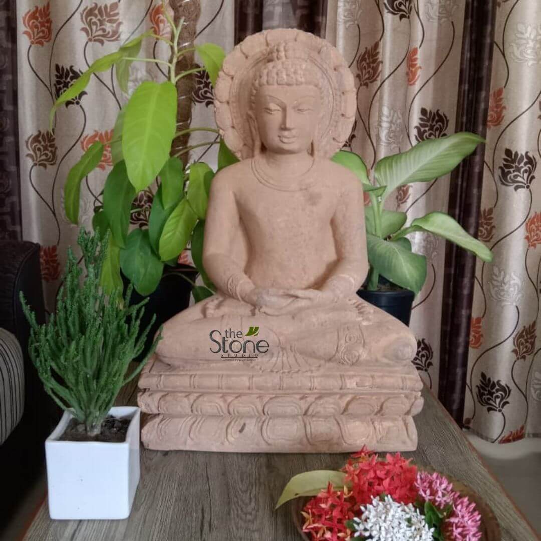 - This 18-inch Buddha statue, crafted from unpolished brown sandstone, exudes a timeless antique charm.
