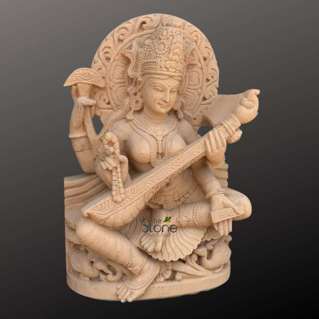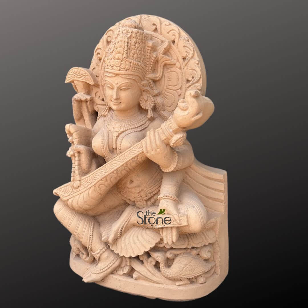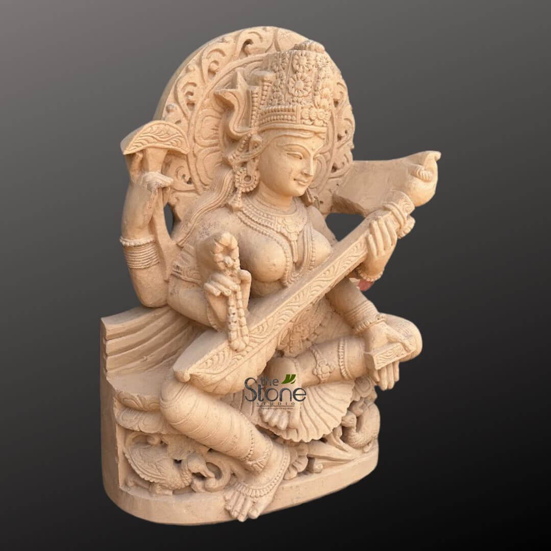 - Increasing visual interest: The Saraswati sculpture may give a remarkable feature to your garden or home while also being visually appealing. The statue can also be placed in temples or in a living room as a unique piece of art. Depending on the client’s own preference, the statue can be created on any stone by The Stone Studio (detailing may differ according to the stone and size).