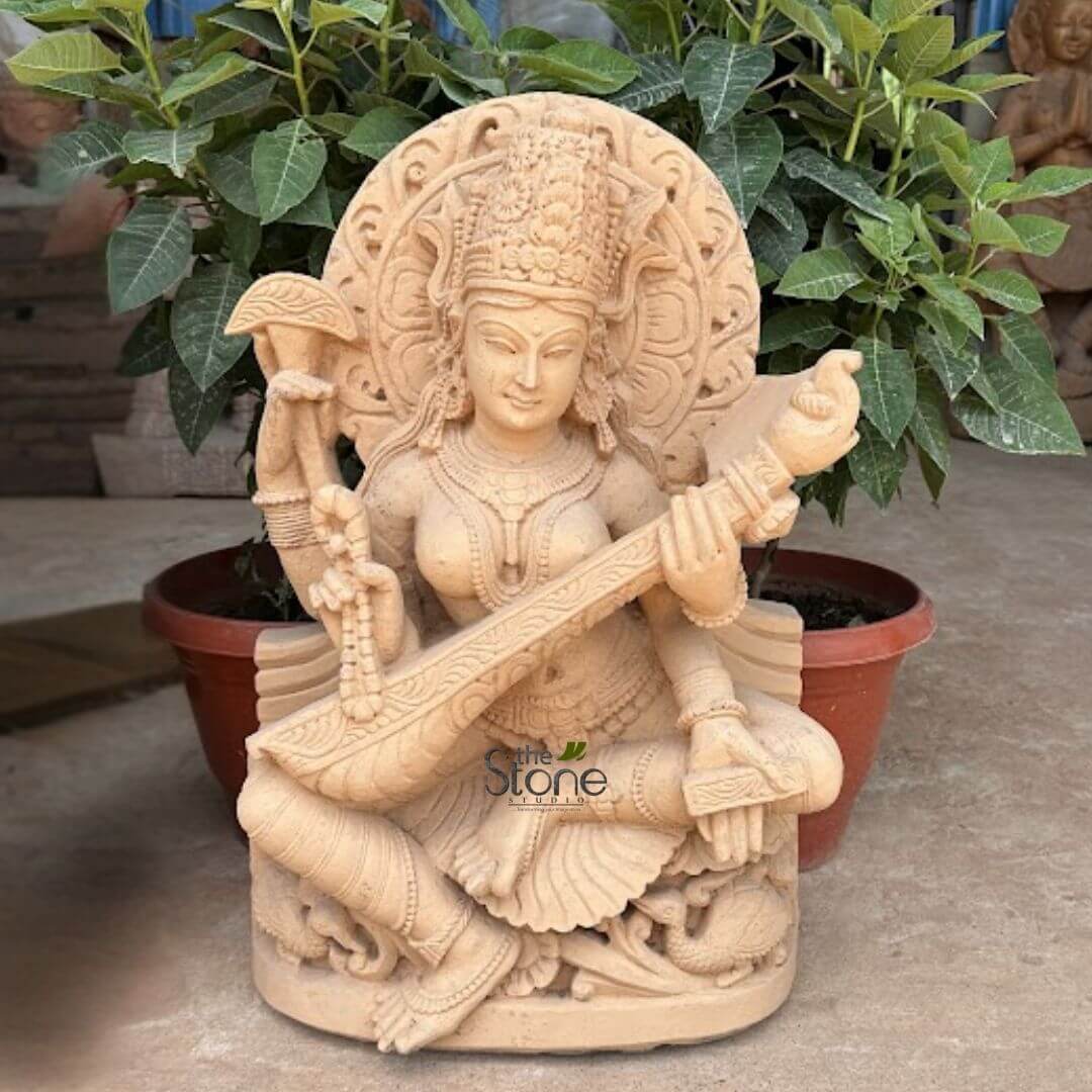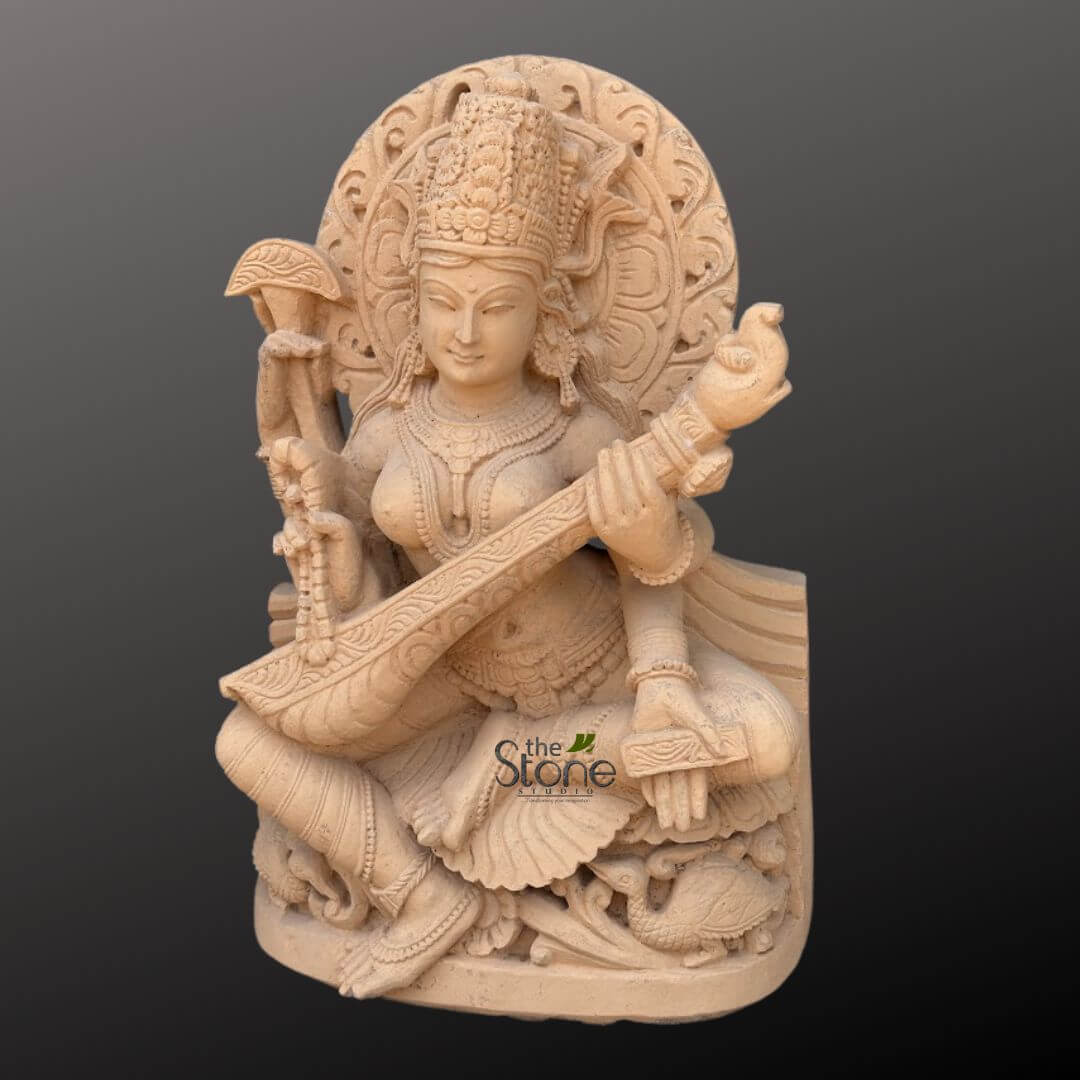 The material used in it is sandstone. This sculpture is wonderfully crafted by our best artisans. For more such statues browse our website. If you still don’t get what you want, our artisans will craft your specified designs of 2ft Maa Saraswati Statue with utmost care and love.