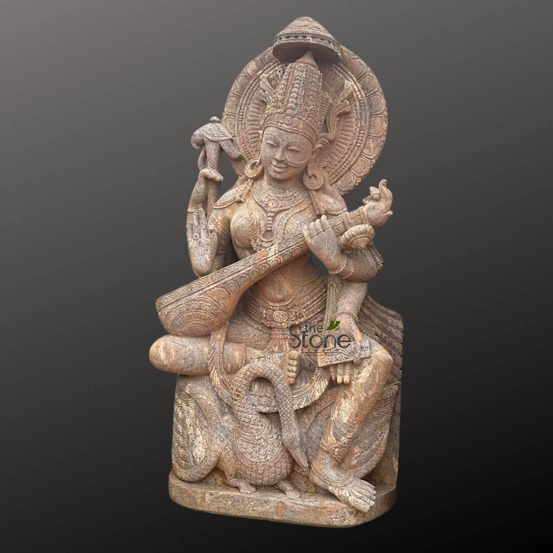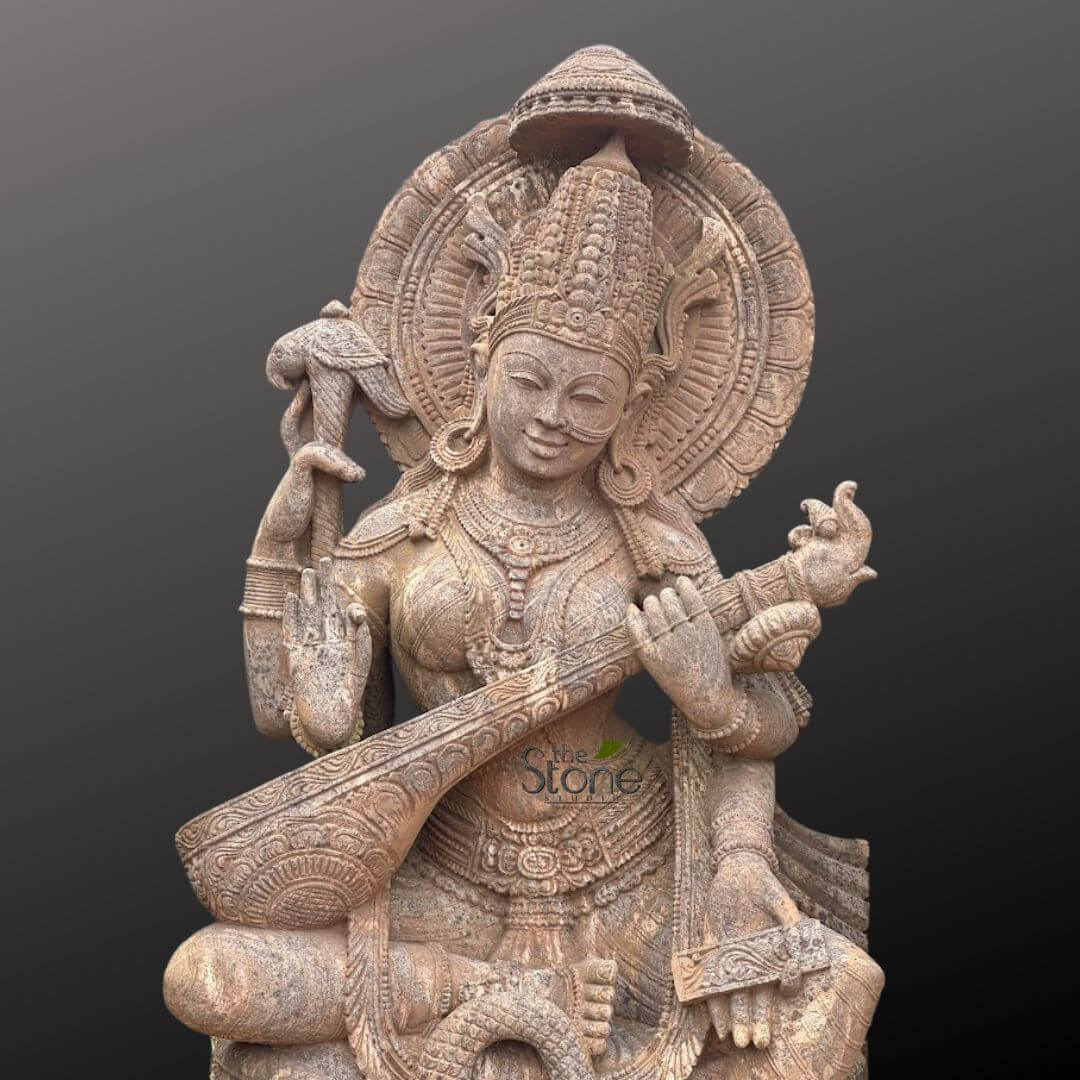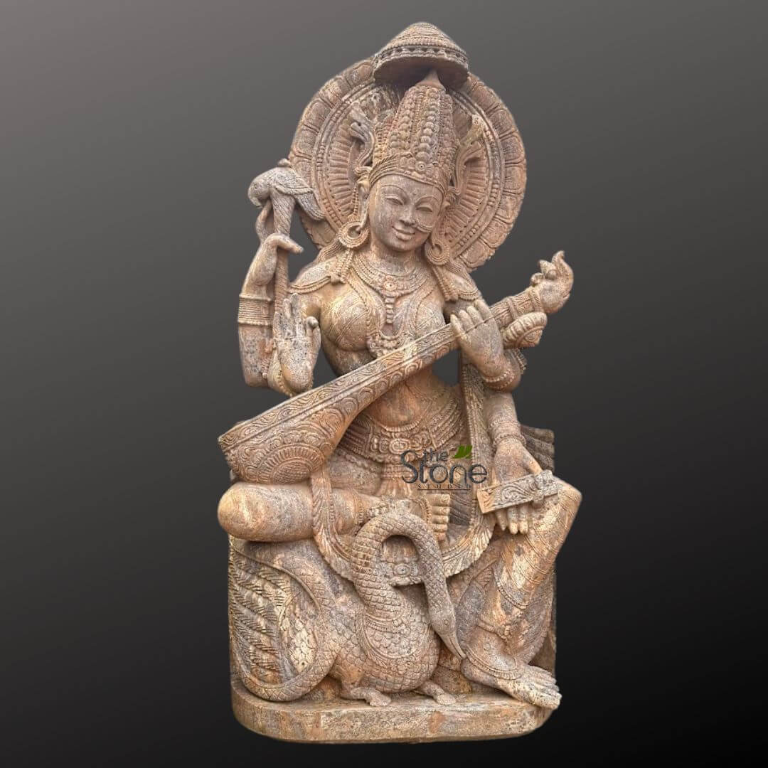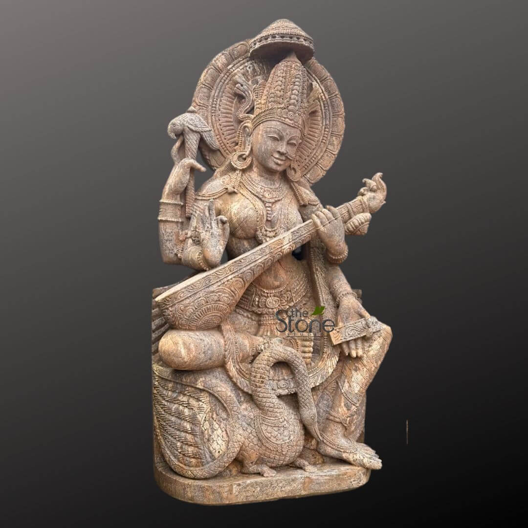 - Standing at 5 feet tall, this exquisite statue shows Saraswati seated in a serene pose, radiating knowledge, insight, and creativity.