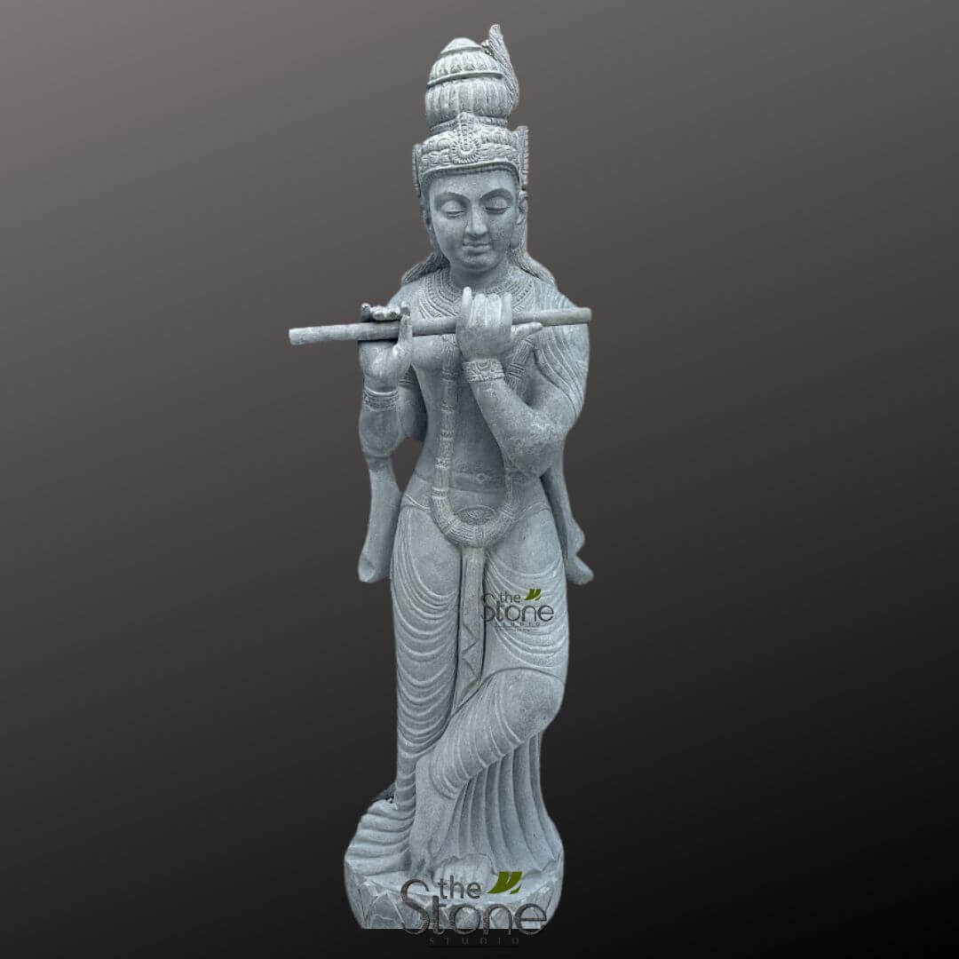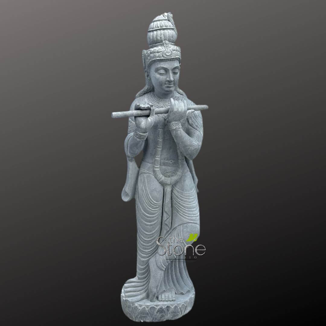 This exquisite 6ft Krishna statue is meticulously hand-carved from premium quality granite stone, showcasing Lord Krishna in his graceful flute-playing posture.