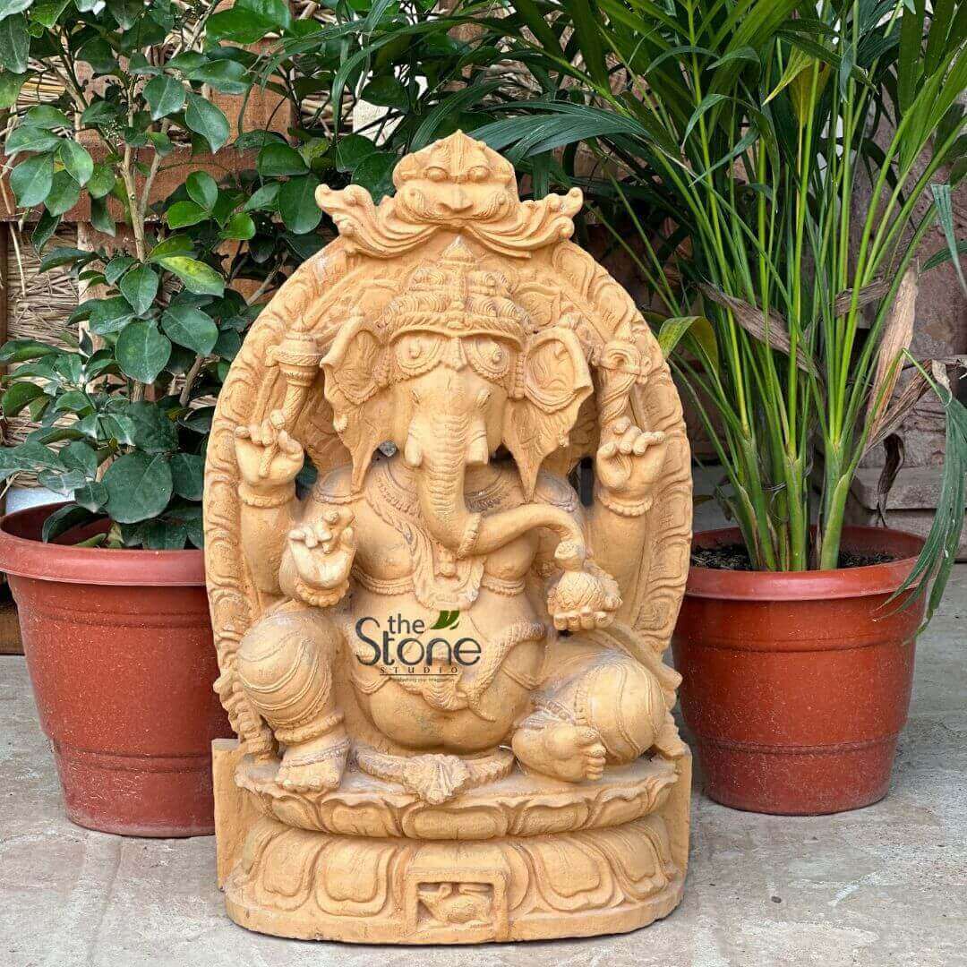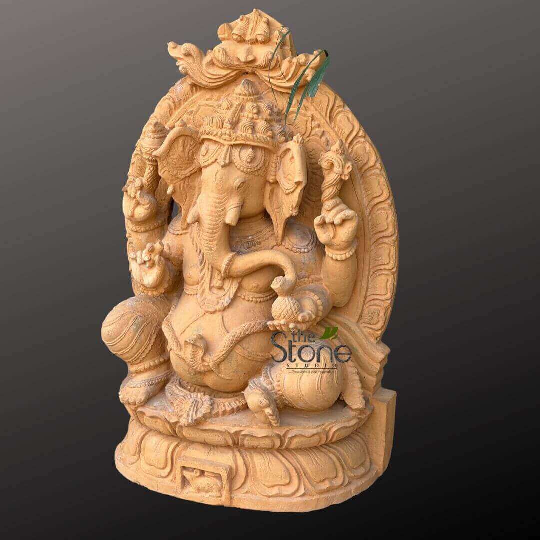 The material used in it is sandstone. Our best artisans wonderfully craft this sculpture. For more such statues browse our website. If you still don’t get what you want, our artisans will craft your specified designs of Chaturbhuja Lord Ganesha with utmost care and love.
