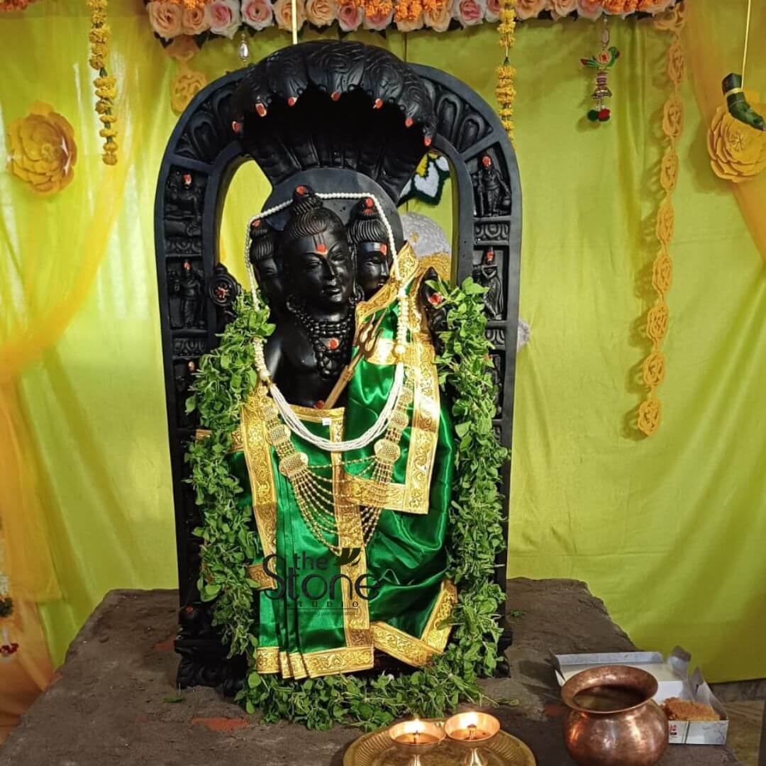 - The sculpture is adorned with intricate features that capture the deity’s tranquil look, his numerous faces representing the trinity of gods, and his divine accouterments such as the sacred conch shell, discus, and staff.