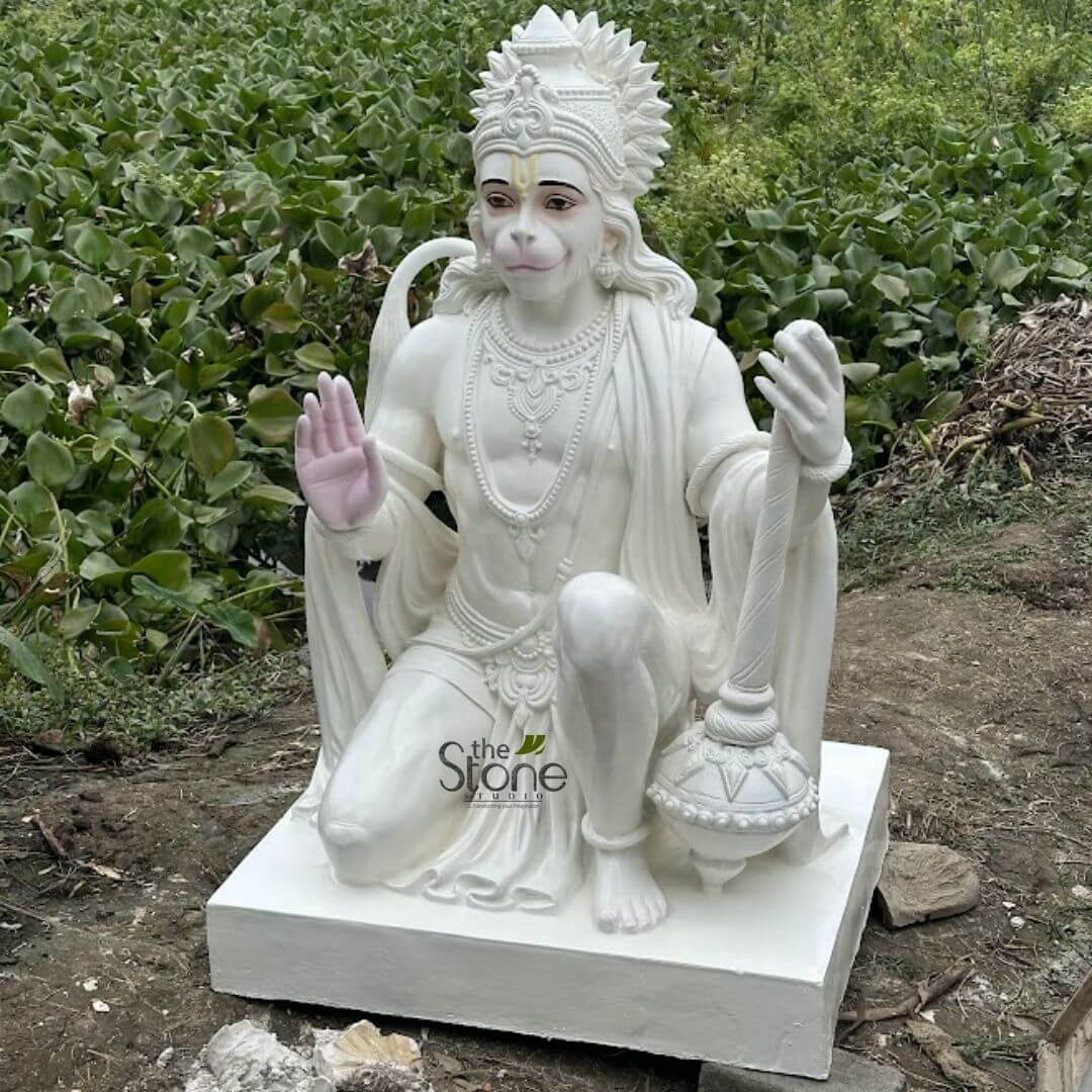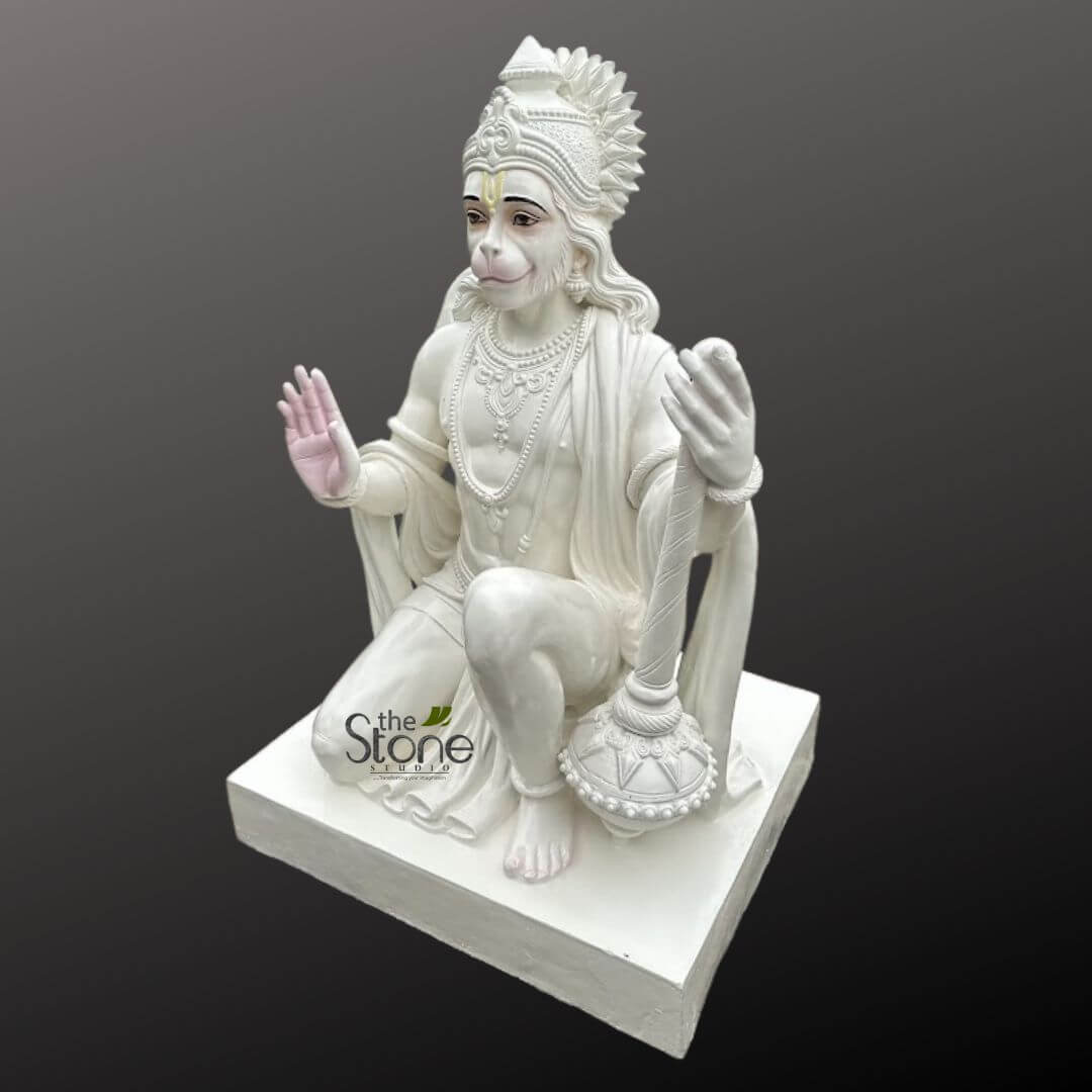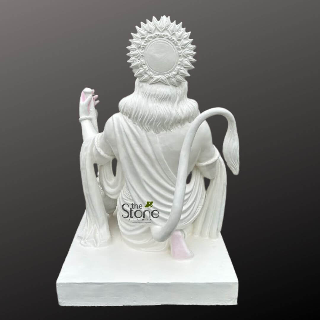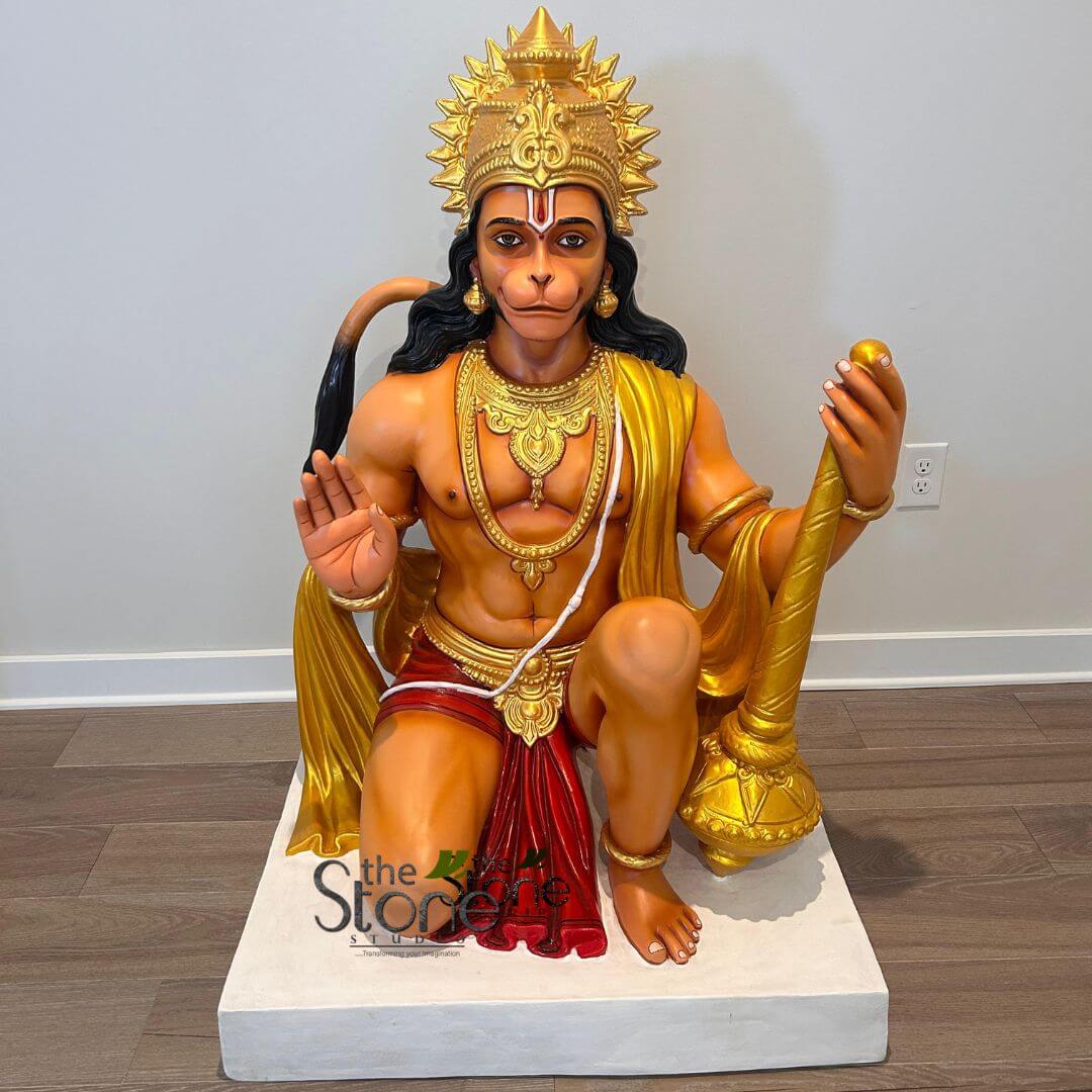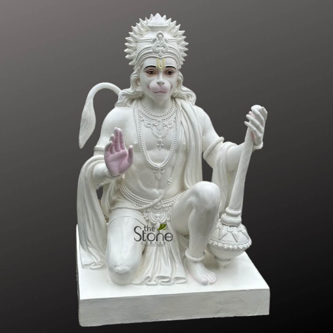 - This exquisite Hanuman statue, crafted from high-quality fiber, captures the divine presence of Lord Hanuman in a serene kneeling posture with his right hand raised in the Ashirwad Mudra (blessing gesture).